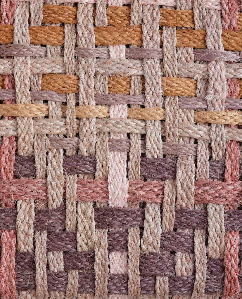 Ilustración: detalle de “Color Weaving 4”. Sisal teñido con cochinilla de Oaxaca y corteza de tzalam y palo de mora de Yucatán. Las trenzas son tejidas por artesanos de Yucatán con quienes Emma Gavaldon van Leeuwen Boomkamp trabaja desde 2017.