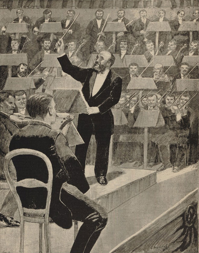 «En los conciertos de invierno», Charles Lamoureux en su pupitre de director de orquesta, estampa. Gallica – BnF
